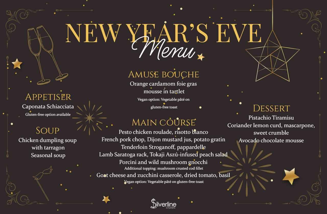 The price of our New Year’s Eve cruise includes a welcome cocktail, a 5 course dinner, sparkling wine and an up to par musical experience.